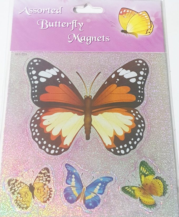 Set of 4 Butterfly Magnets on one sheet. One large and 3 small. Brightly coloured with glitter backgrounds.