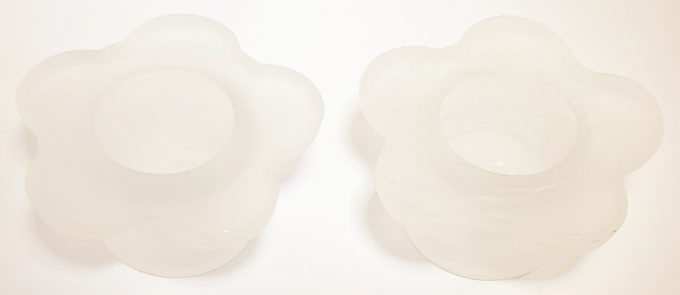 Set of 2 flower shaped glass candle holders.