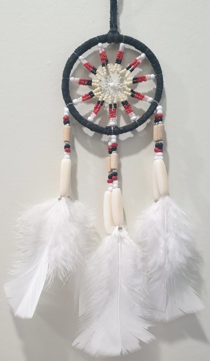 In Ojibwe (Chippewa) culture, a dreamcatcher (or dream catcher; Ojibwe asabikeshiinh, the inanimate form of the word for “spider” or bawaajige nagwaagan meaning “dream snare”) is a handmade object based on a willow hoop, on which is woven a loose net or web.  The dreamcatcher is then decorated with personal and sacred items such as feathers and beads.