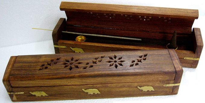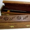 Wooden incense ashcatcher box with Square Lid, brass inlay and secret compartment for storage of incense sticks.
